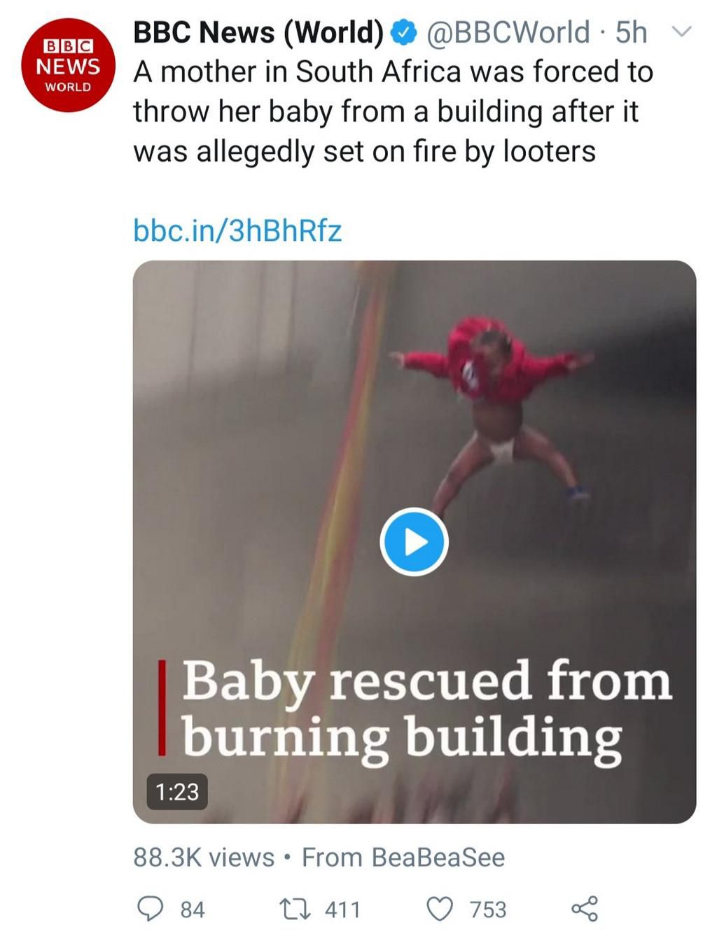 Heart-stopping moment a baby is thrown from burning story building in South Africa