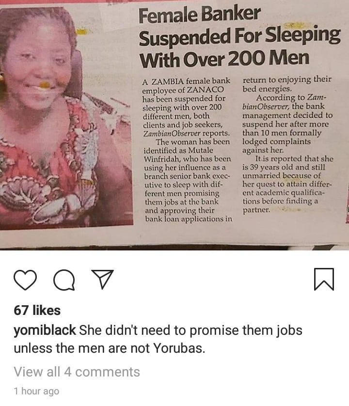 Some were taken aback to learn that a woman has tactfully executed the sex for job syndrome that they thought was exclusively reserved for men, while others wished they would have the chance to be exploited by Mutale Winfridah.