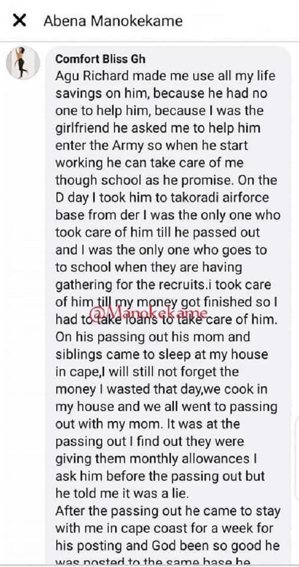 In the letter, she alleged that she had invested a lot of money to see Richard Agu through the military school but after graduating he dumped her.