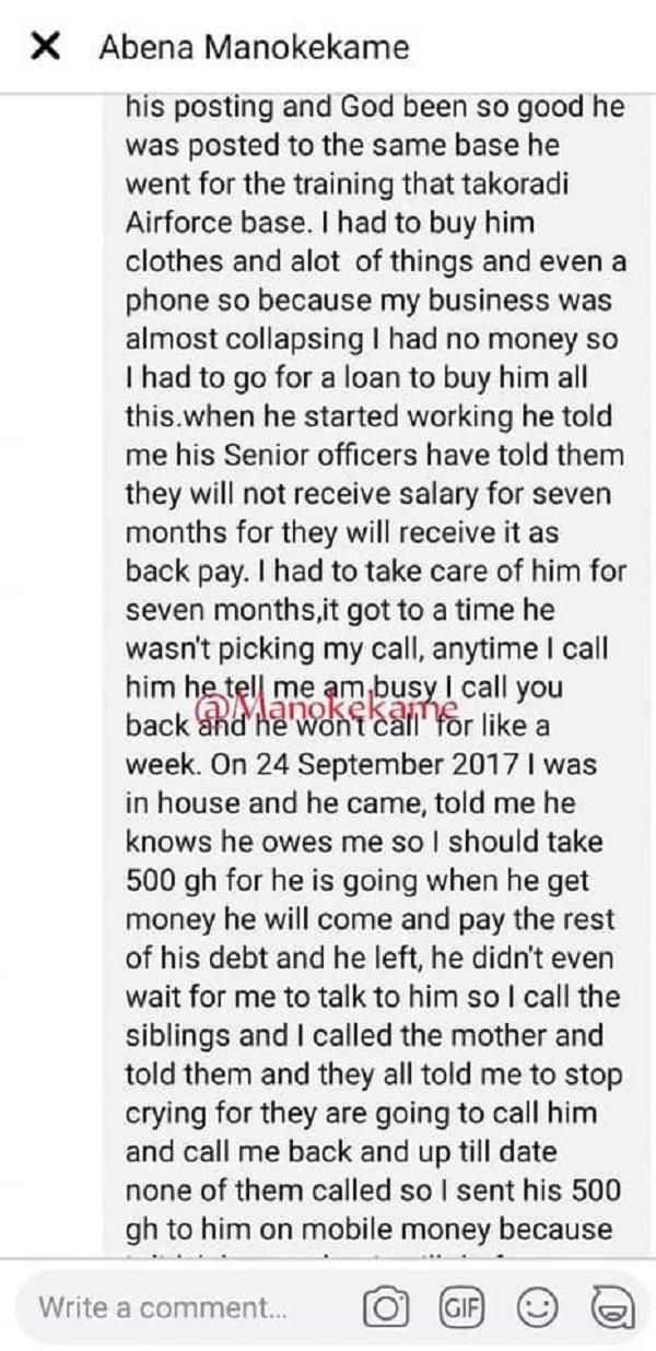 Her story went viral on social media after she wrote a long write-up to Abena Manokekame, a popular relationship page on Facebook to seek advice.