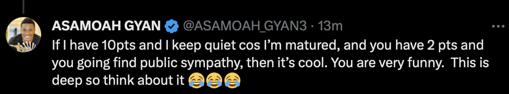 Following a post on Ameyaw Debrah, Gyan replied to the post, writing on his X (formerly Twitter) page with over one million followers: