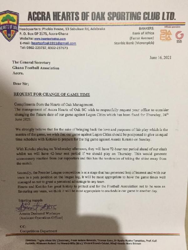 However, the club wrote to the FA requesting for their game against the Royals to be postponed to give them ample time to prepare for the Kotoko showdown.