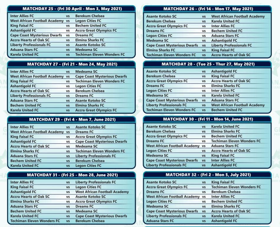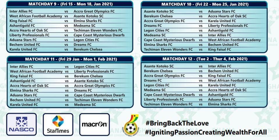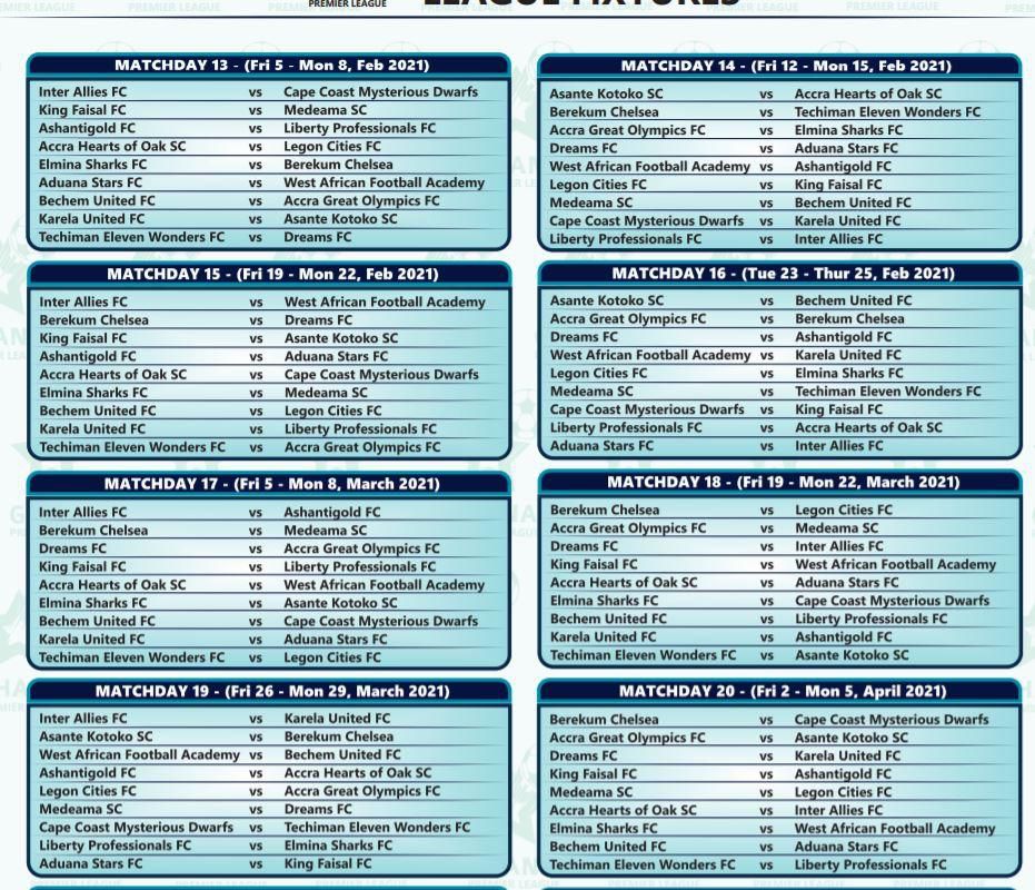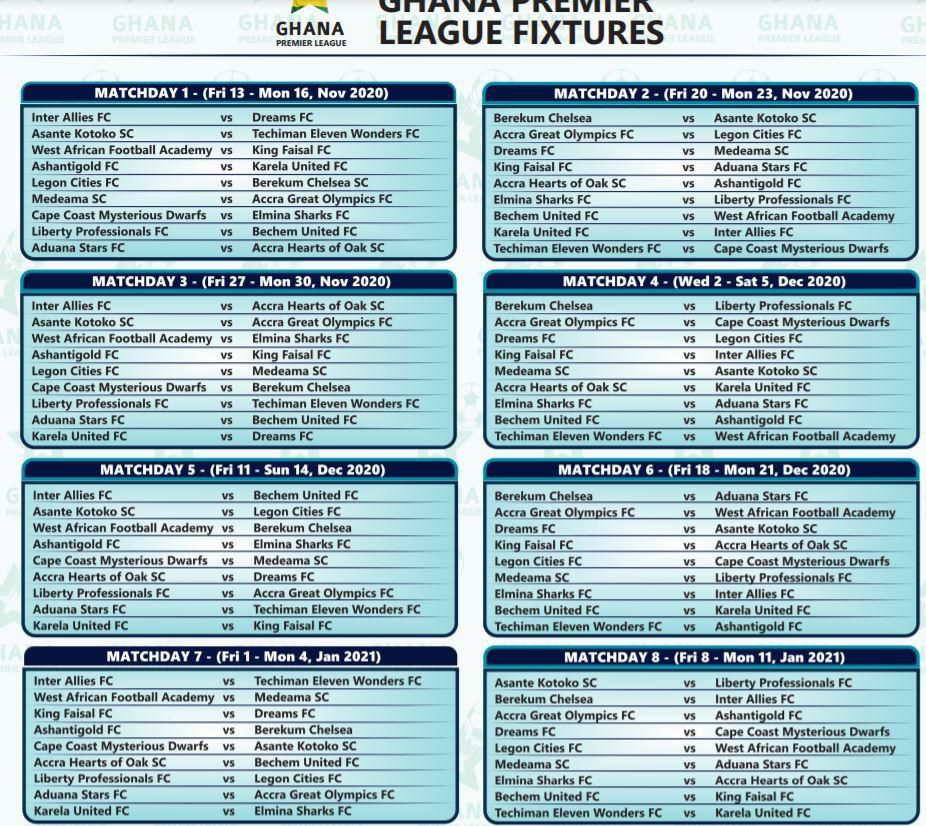 Ashantigold SC, Asante Kotoko SC, Medeama SC will all begin the new season at home whereas Hearts of Oak, Karela FC and Dreams FC will be on the road on Matchday 1 of the season.