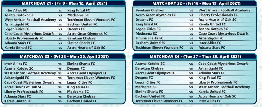 Meanwhile the biggest game on the Ghanaian football calendar is the clash between Hearts of Oak and Asante Kotoko dubbed Super Clash: The first round of the encounter falls on Match Day 14 on Sunday 14 February 2021 which is also the Valentine's Day and the second round fixture is scheduled for Sunday 27 June 2021 at the Accra Sports Stadium where Hearts of Oak host Asante Kotoko.