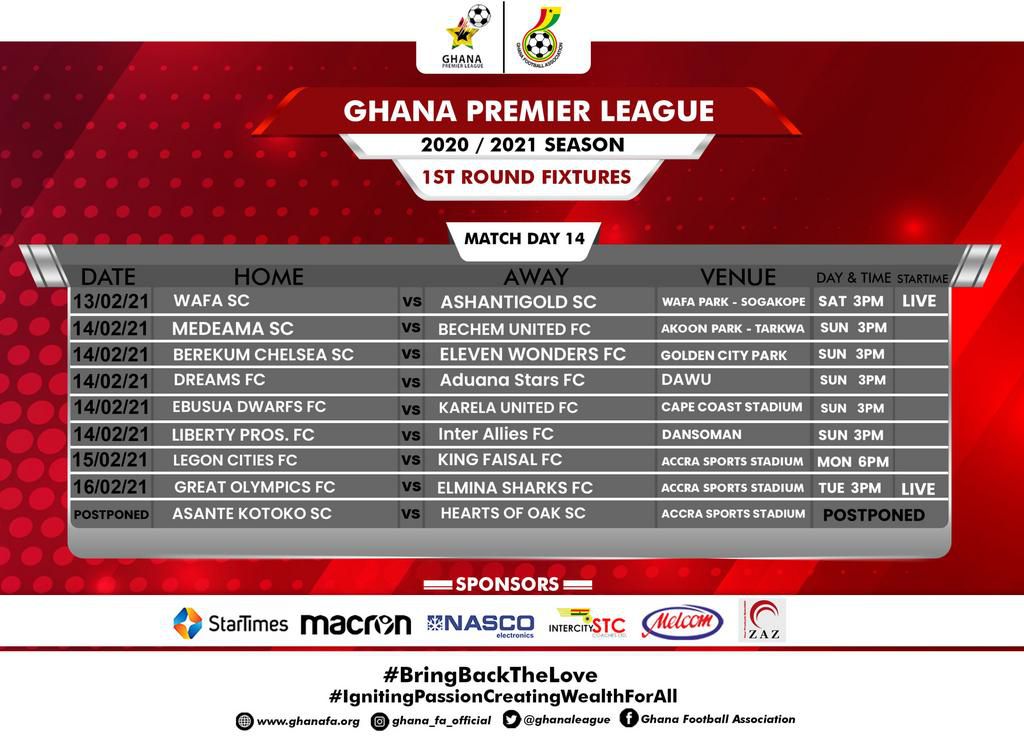 Also, the match between Medeama SC and Bechem United whivch was originally scheduled for Friday, February 12, has been moved to Sunday, February 14, 2021 at the Akoon park at Tarkwa.