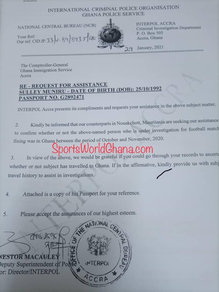 In an INTERPOL letter dated January 29, 2021, and addressed to the Controller General of the Ghana Immigration Service(GIS), the Police disclosed that Muniru is under investigation for alleged football match-fixing and were seeking to know whether he was in Ghana between the period of October and November 2020.