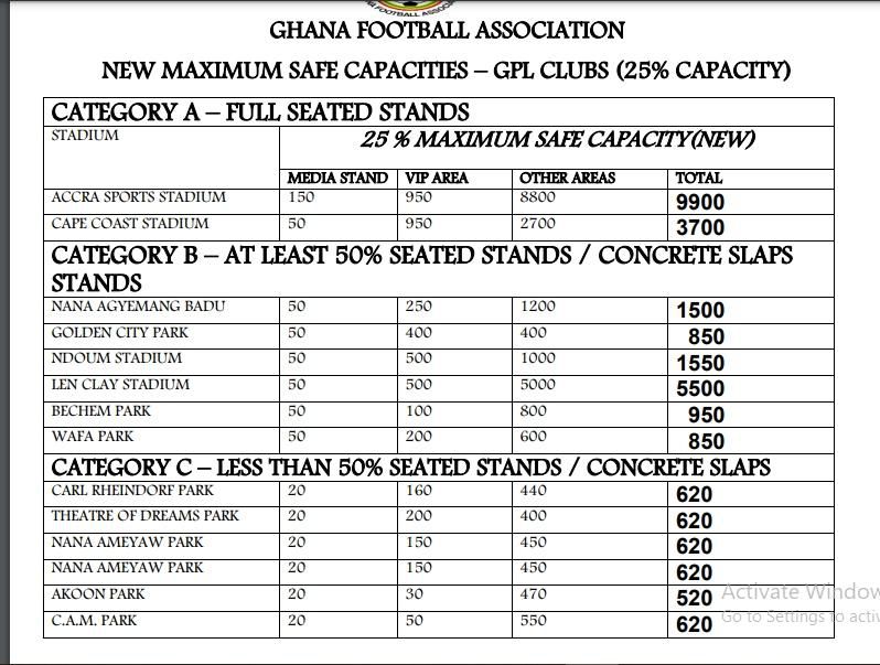 According to the Executive Council of the GFA, after getting the required approval to admit fans to their stadia, the sitting at all the underlisted stadia shall be limited to the 25% capacity granted by government aimed at ensuring social distancing and observing COVID-19 protocols.