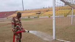 In a video circulating online, personnel from the Ghana Fire Service can be seen watering the parched pitch under the supervision of NSA officials, in what appears to be an urgent attempt to restore the field.
