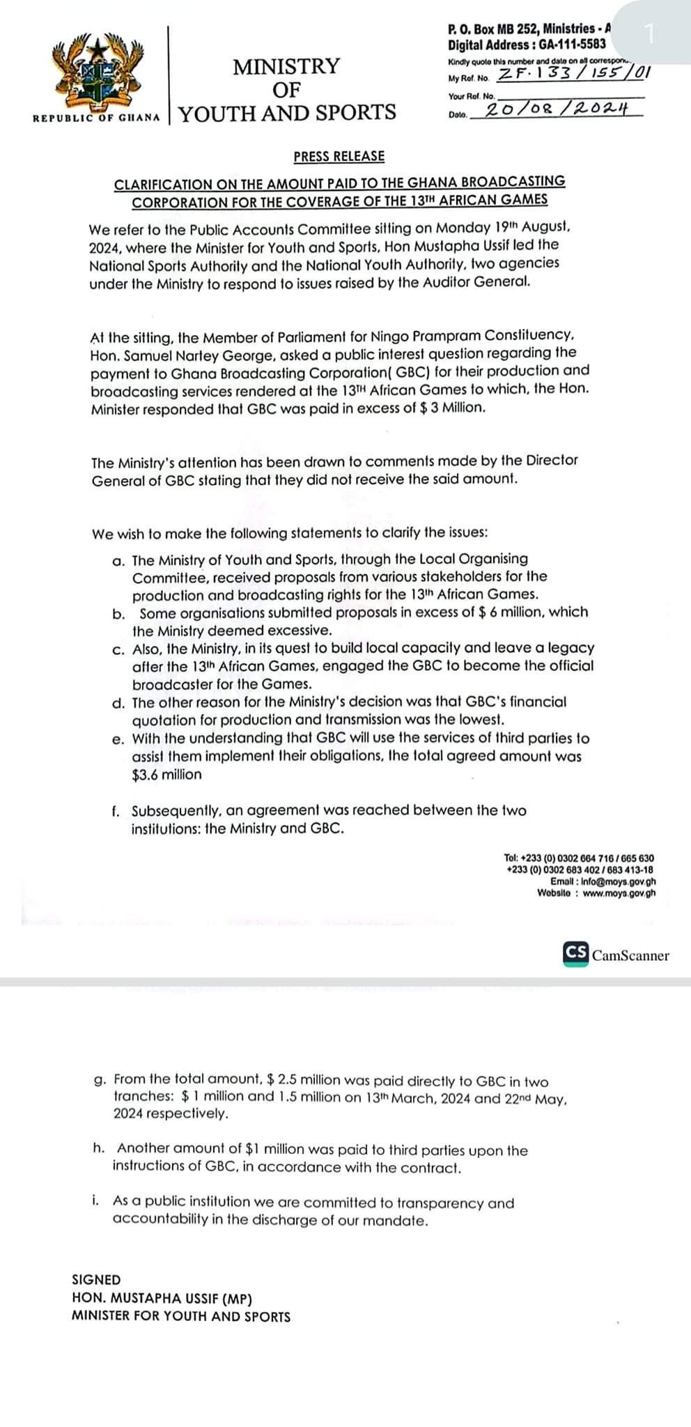 A statement released by sector Minister, Mustapha Ussif, said some media organisations submitted proposals to cover the Games but an agreement of $3.6 million was ultimately reached between the Ghana Broadcasting Corporation (GBC) and the Sports Ministry.
