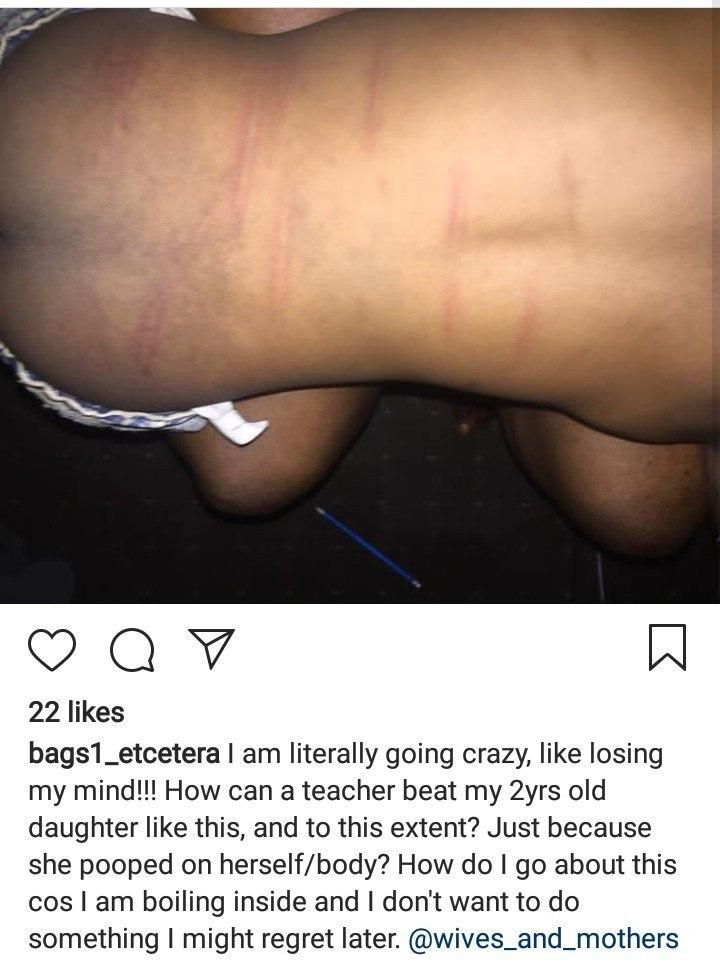 A two-year-old girl has been mercilessly beaten by her teacher because she pooped in her pants, her angry mother has revealed in a post on Instagram.