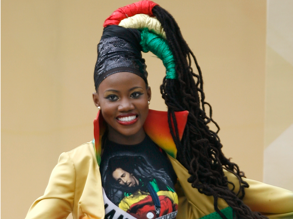 Zahra Redwood, Miss Jamaica Universe 2007, rocked Rasta-colored hair wraps and a Bob Marley shirt.