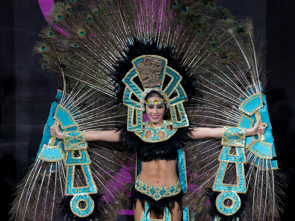 Miss Honduras 2013 Diana Schoutsens costume combined peacocks and traditional Mayan clothing.