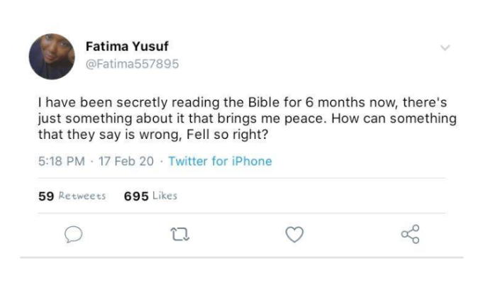 “I have been reading the Bible for 6 months now, there’s just something about it that brings me peace,” Fatima Yusuf wrote on Twitter.