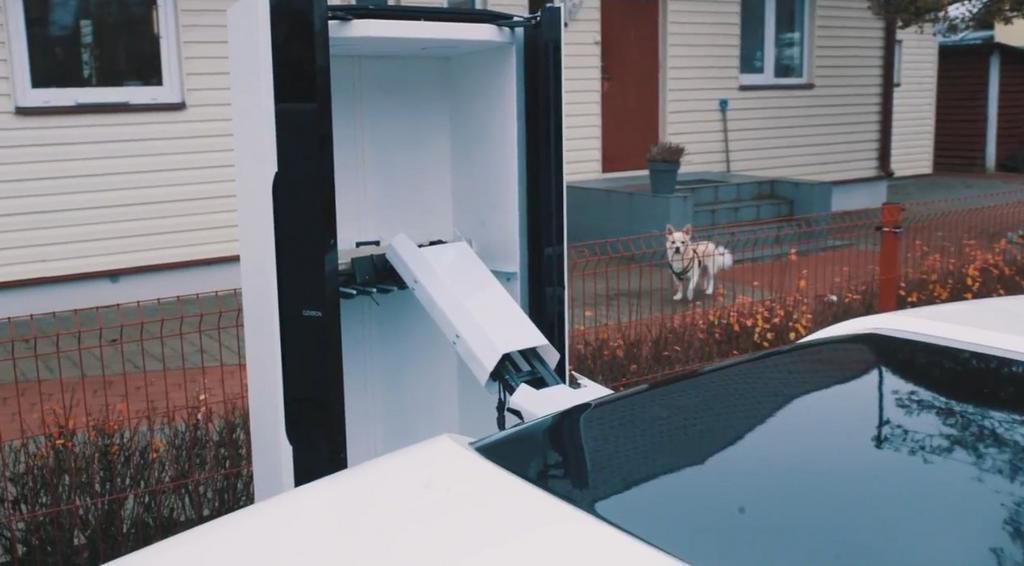 The car, called Lotte, is a robotic courier. It autonomously transports packages to homes and businesses and uses a robotic arm to place the packages in a pickup locker. Eventually, it will be able to deliver packages to mailboxes and pickup towers as well.