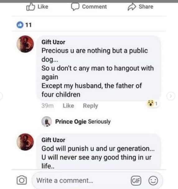 The highly bitter wife wrote: “Precious u are nothing but a public dog…So u don’t c any man to hangout with again except my husband, the father of four children. God will punish u and ur generation. U will never see any good in ur life.”