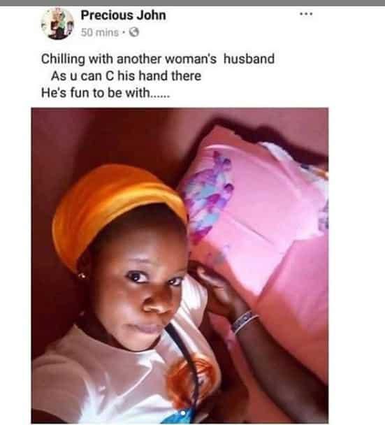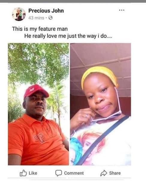 The lady identified as Precious John resorted to the social media platform to post a collage photo of herself and the married man which she captioned: “this is my feature man. He really love me just the way I do”.