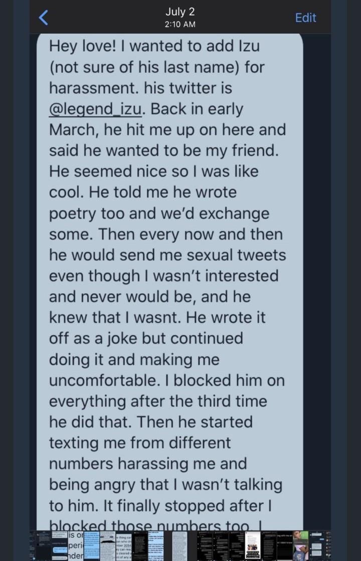 Izu was referring to the list posted on Twitter where a number of men were named as people accused of sexual assault, harassment, or rape. Izu’s name was listed and he was accused of harassment.