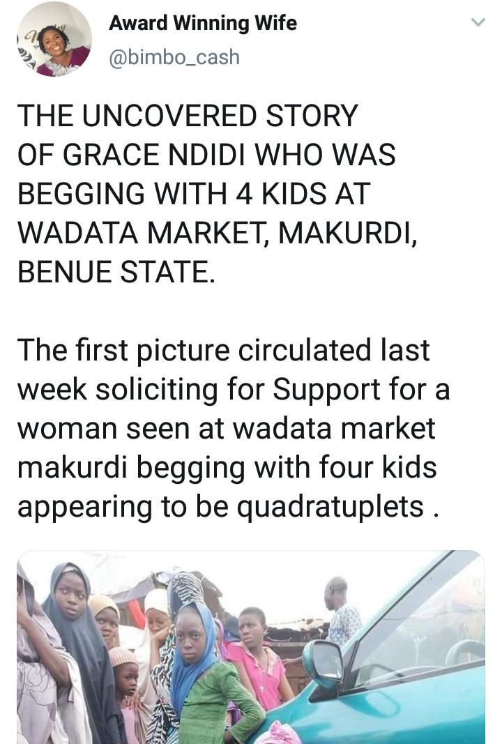 The woman who was found begging in Benue state said she needed to go to Onitsha for the certificate.