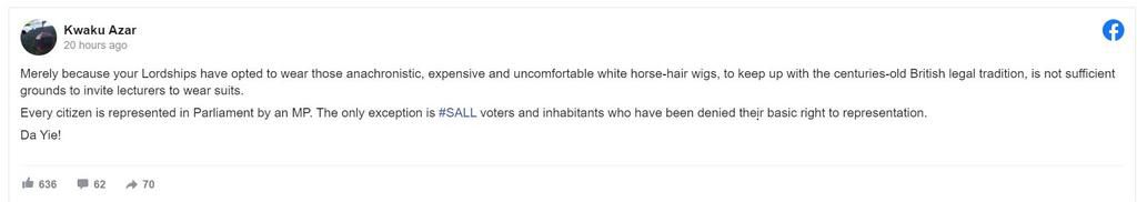 “Merely because your Lordships have opted to wear those anachronistic, expensive and uncomfortable white horse-hair wigs, to keep up with the centuries-old British legal tradition, is not sufficient grounds to invite lecturers to wear suits…” he wrote on Facebook.