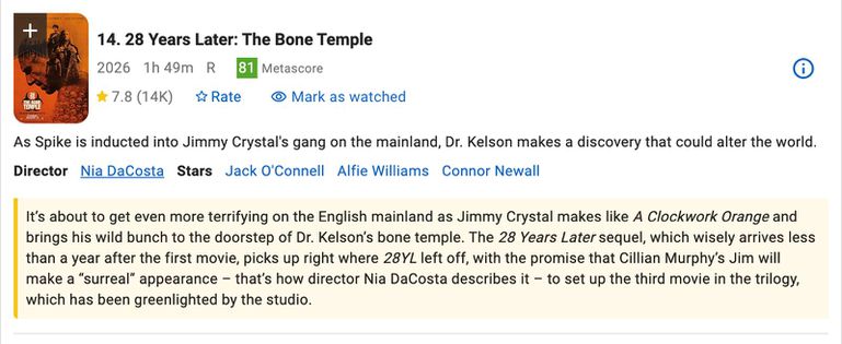 The Bone TempleThe rage virus returns. Expanding the world first introduced in 28 Days Later and 28 Weeks Later, 28 Years Later: The Bone Temple promises a chilling look at a world that has lived with apocalypse for decades. Horror fans are bracing for a grim, intense, and politically charged sequel.