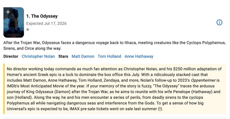 Homer’s ancient epic is getting a modern cinematic treatment, and expectations are high. The Odyssey promises a sweeping retelling of Odysseus’ long journey home, blending myth, action, and emotional depth. With advances in visual effects and renewed interest in epic storytelling, this adaptation could become a defining historical fantasy film.