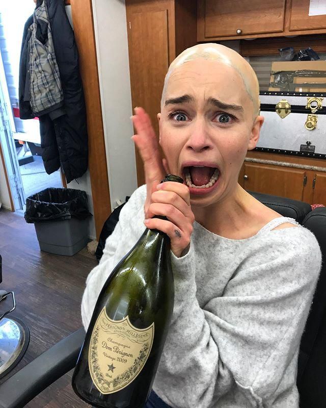 2) May 2019 Mid-Daenerys-transformation, Emilia shared a BTS photo with her makeup off and bald cap on while wielding a drink to relax her nerves before filming. See the original post on Instagram See the original post on Instagram See the original post on Instagram See the original post on Instagram See the original post on Instagram emilia_clarke@Instagram