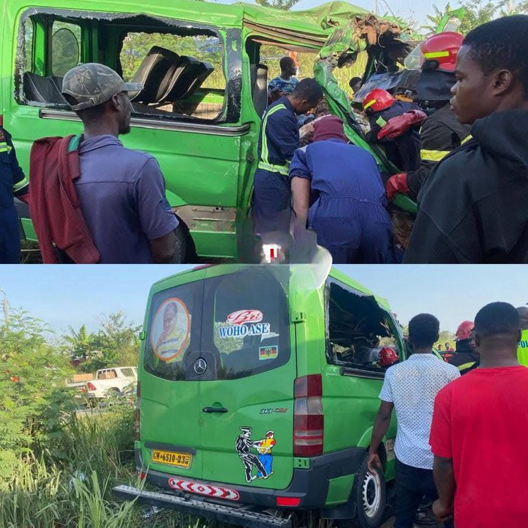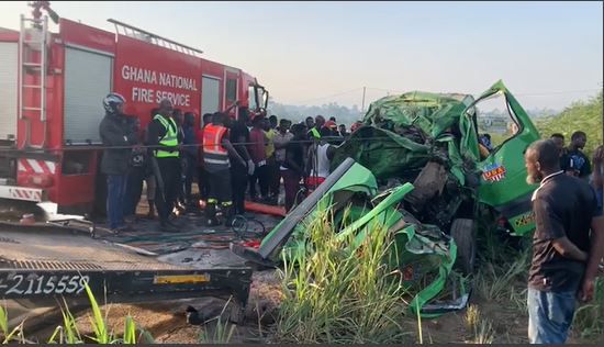 The crash occurred when a fuel tanker traveling towards Accra veered off its lane and collided head-on with a Sprinter bus.