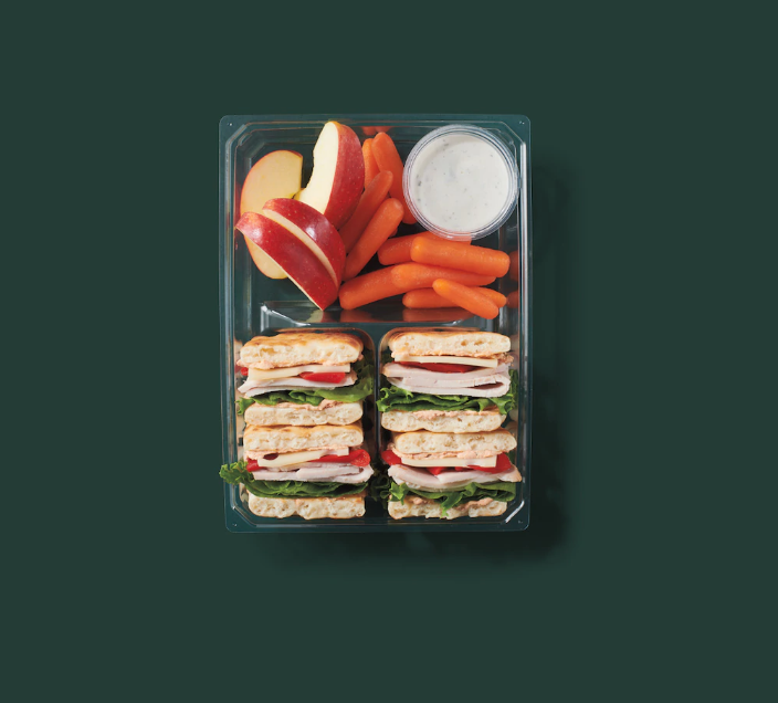 Starbucks Smoked Turkey Protein Box This protein-rich meal includes both fresh fruits and vegetables, which Ivey says is always a plus. Just watch out for the sodium, which comes in at 70 percent of your recommended daily value, she notes. Per serving: 570 calories, 23 g fat (10 g saturated), 54 g carbs, 20 g sugar, 1,620 mg sodium, 7 g fiber, 35 g protein Courtesy Image