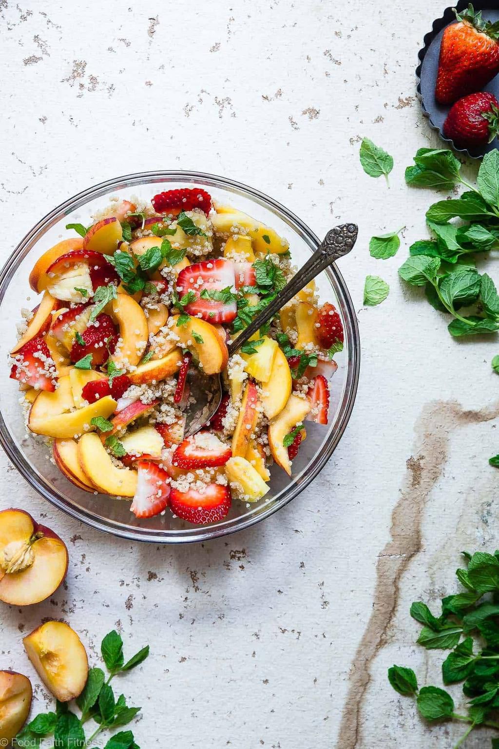 Coconut Milk Quinoa Fruit Salad Mint, lime, and coconut give this salad the festive flair of a mojito, minus the buzz. It's also filled with strawberries, nectarines, pineapple, and quinoa Get the recipe Per serving: 220 calories, 10 g fat (7 g saturated), 30 g carbs, 68 mg sodium, 13 g sugar, 3 g fiber, 4 g protein Food Faith Fitness