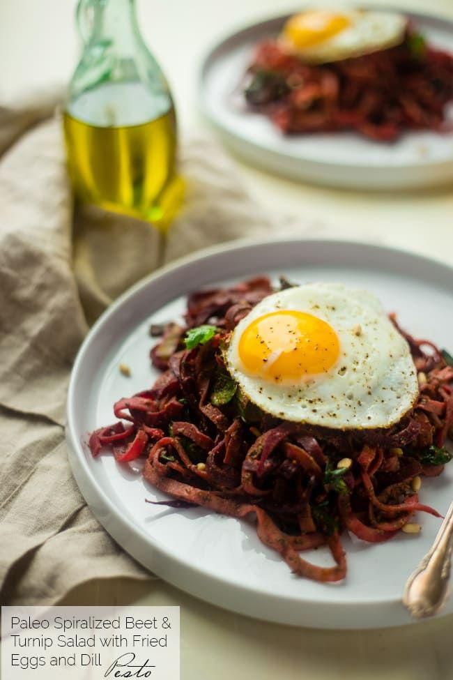 Spiralized Beet Salad with Turnips, Pesto, and Fried Eggs Seriously, whens the last time you swapped your zoodles for beets? For starters, they make things a lot more interesting in the antioxidant department (and they look pretty damn cool on Instagram). Get the recipe Per serving: 278 calories, 21 g fat (3 g saturated), 15 g carbs, 167 mg sodium, 7 g sugar, 4 g fiber, 10 g protein Food Faith Fitness