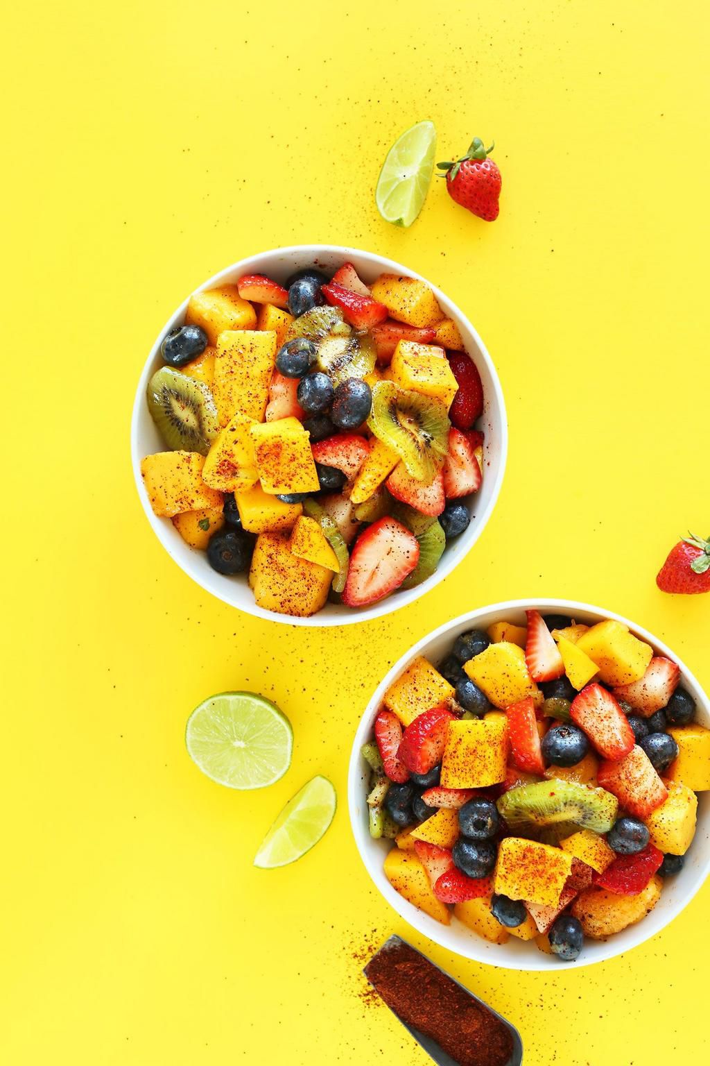 Spicy Fruit Salad Kickstart your morning with mangoes, kiwis, strawberries, and blueberries, all topped with metabolism-boosting chili powder. Get the recipe Per serving: 112 calories, 1 g fat (12 g saturated), 27 g carbs, 44 mg sodium, 21 g sugar, 4 g fiber, 1 g protein Minimalist Baker