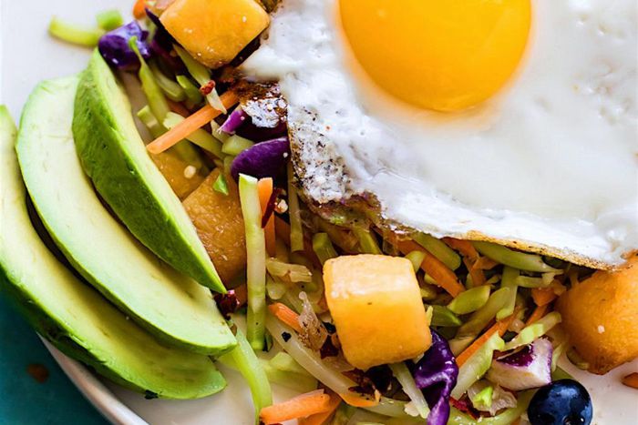 Blueberry Sweet Potato Savory Breakfast Salad Topped with parsley and hemp seeds , this fruity and flavorful salad packs loads of crunch and healthy fats. Get the recipe Per serving: 523 calories, 38 g fat (12 g saturated), 58 g carbs, 156 mg sodium, 15 g sugar, 15 g fiber, 8 g protein Minimalist Baker