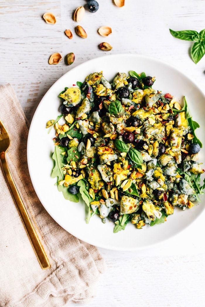 Blueberry Breakfast Salad Hows this for a wild idea? Scramble blueberries, cinnamon, and pistachios into your eggs so they get all nice and gooey like pie filling. Stack it on top of a bed of greens and dig in. Get the recipe Per serving: 188 calories, 9 g fat (1 g saturated), 11 g carbs, 415 mg sodium, 6 g sugar, 3 g fiber, 17 g protein Eating Bird Food