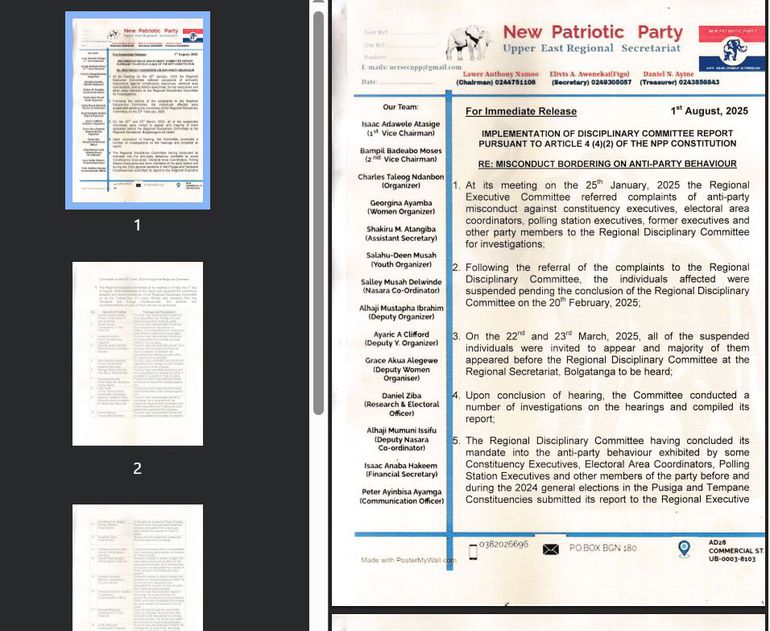 The Upper East Regional Executive Committee of the New Patriotic Party (NPP) has taken decisive disciplinary action against sixteen party members and officials from the Pusiga and Tempane constituencies, following a series of misconduct allegations tied to the 2024 general elections.