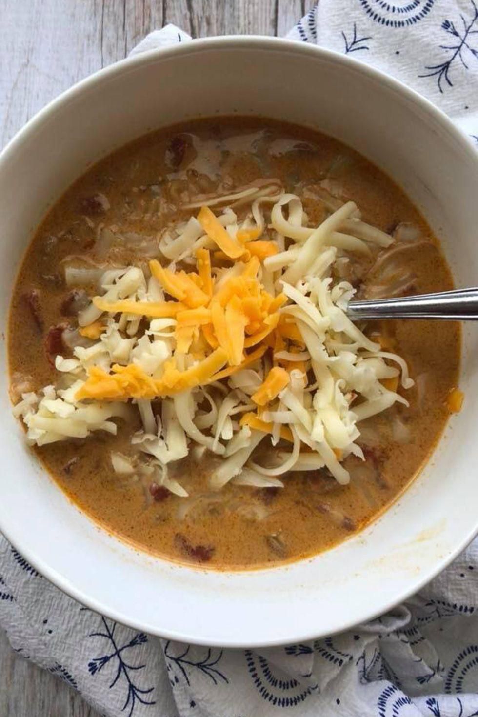 Queso Soup You probably never thought ground beef, cream cheese, and Rotel could make a great soup. But it does. Get the recipe from Kasey Trenum . Per serving: 254 calories, 15 g fat (7 g saturated), 7 g carbs, 3 g sugar, 1099 mg sodium, 1 g fiber, 21 g protein. Kasey Trenum