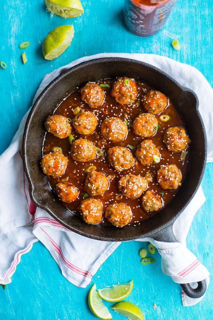 Honey Sriracha Turkey Meatballs These spicy turkey meatballs from A Saucy Kitchen taste amazing over zoodles and cauliflower rice, or you can pop on sticks for simple appetizers for your next holiday party or game day event. If you are strict paleo, make sure that your sriracha is paleo-approved first. A Saucy Kitchen