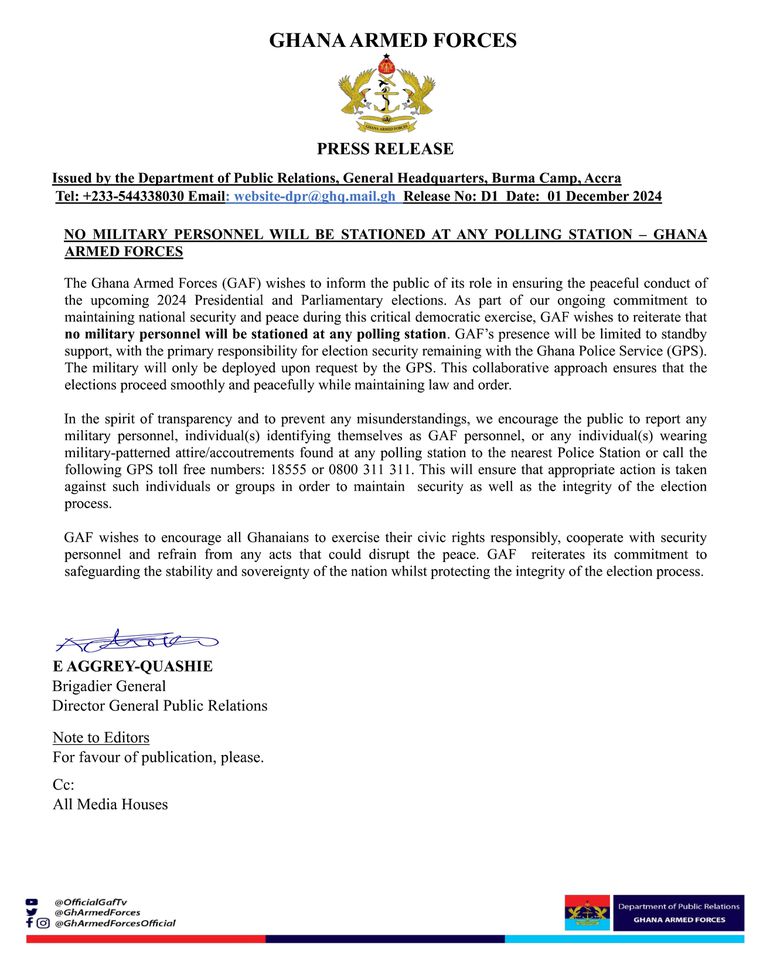 In a statement dated December 1, 2024 and signed by Director General of Public Relations Brigadier General E. Aggrey-Quashie, GAF emphasised its commitment to peaceful elections, stating: