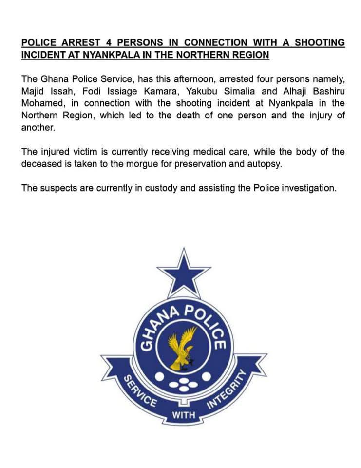 The Ghana Police Service has this afternoon arrested four persons, namely, Majid Issah, Fodi Issiage Kamara, Yakubu Simalia, and Alhaji Bashiru Mohamed, in connection with the shooting incident at Nyankpala in the Northern Region, which led to the death of one person and the injury of another.