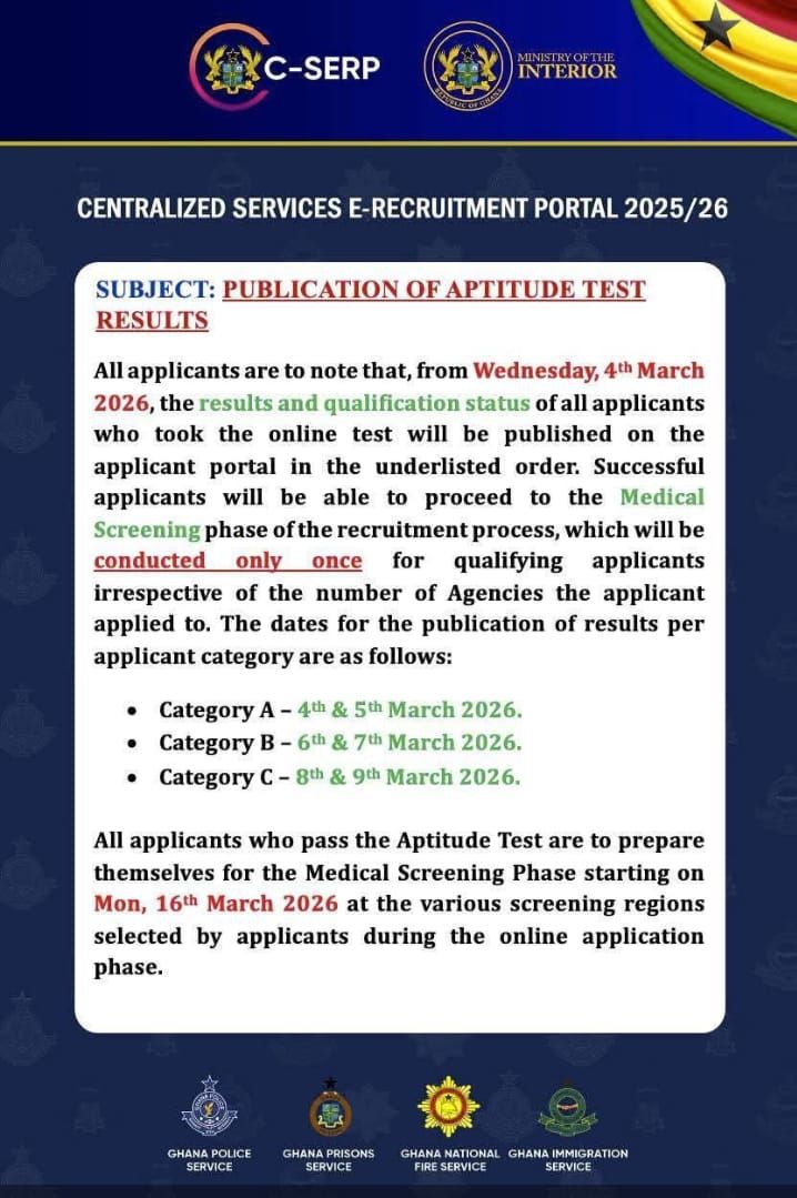 Applicants who pass the aptitude test are advised to prepare for the Medical Screening phase, which begins on Monday, 16 March 2026. Screening will take place at the various regional centres selected by candidates during the online application process.