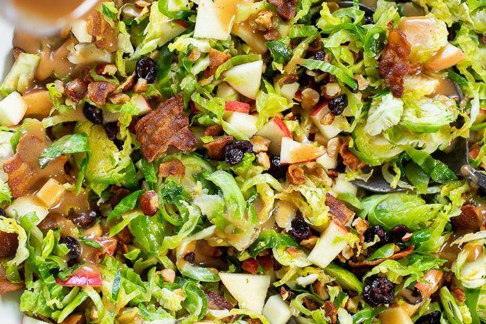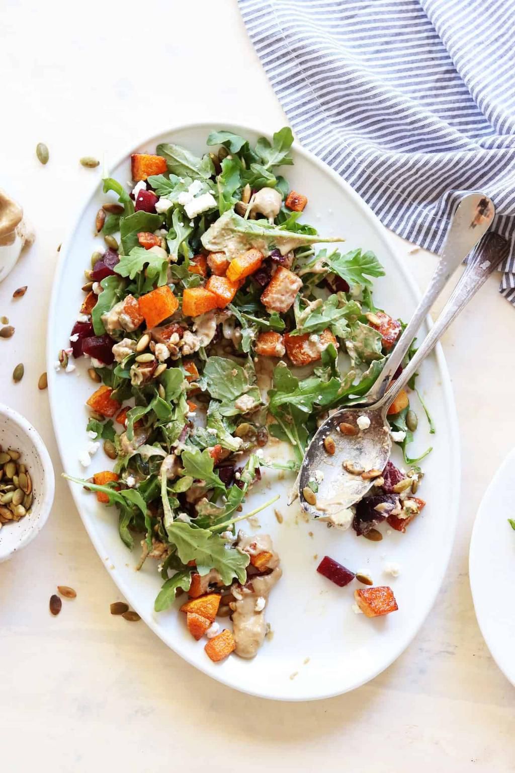 Butternut Squash and Beet Harvest Salad This tasty, vegetarian-friendly fall salad gets lots of color and nutrition from beets, squash, seeds, and cheese. It's a great way to sneak some greens into your feast. GET THE RECIPE Per serving: 223 calories, 13.9 g fat (9.1 g sat), 20.7 g carbs, 7.3 g sugar, 312 mg sodium, 4.3 g fiber, 7.1 g protein Courtesy