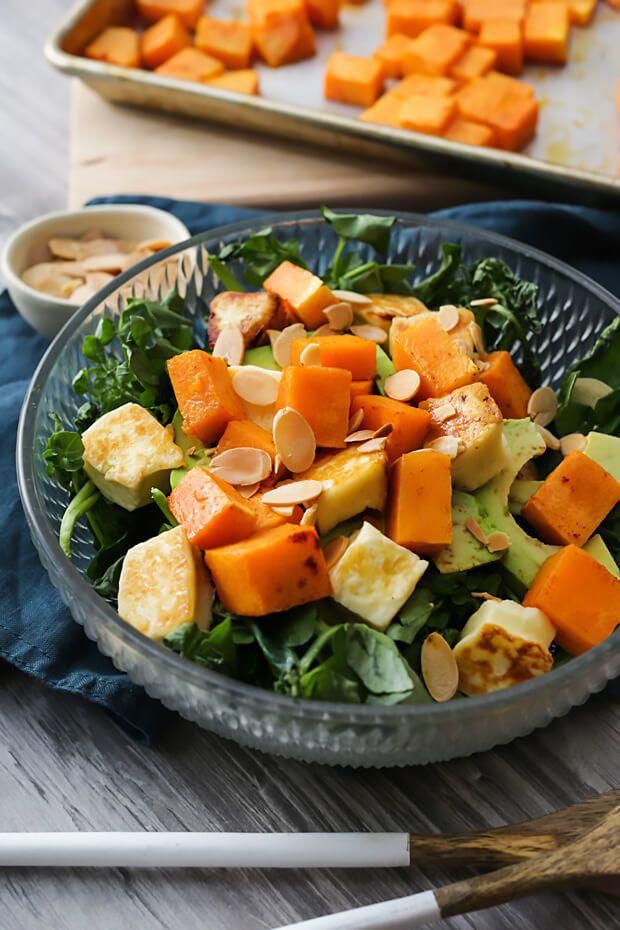 Roasted Pumpkin and Halloumi Salad Salty Halloumi cheese pairs beautifully with fall flavors like pumpkin and almonds in this meatless salad. Chock-full of color and nutrition, it's another feel-good side dish. GET THE RECIPE Per serving: 537.6 calories, 43.9 g fat, 17.8 g carbs, 6.7 g fiber, 19.4 g protein Courtesy