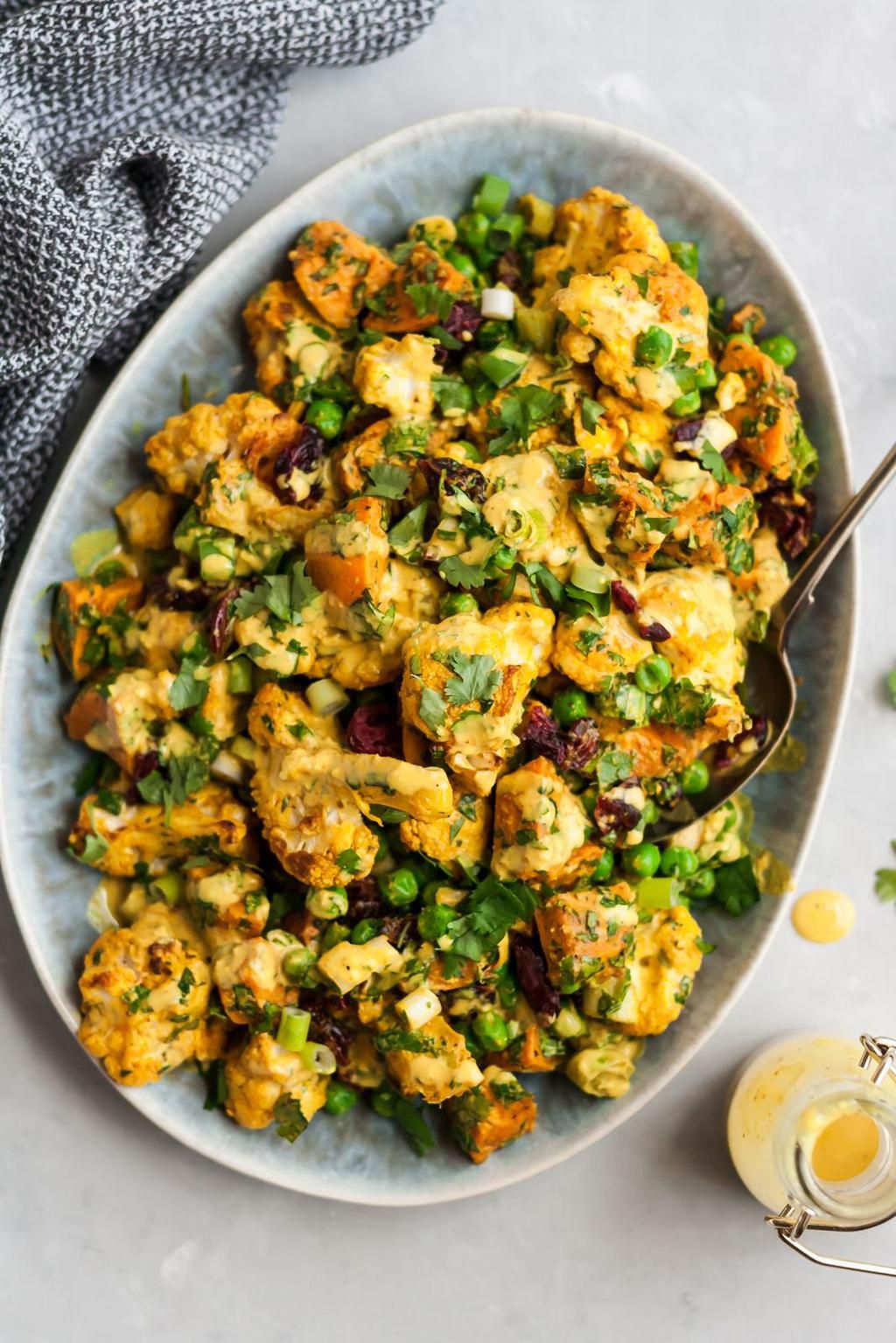 Curry Roasted Cauliflower Sweet Potato Salad Complete with a creamy curry sauce, this veggie-loaded side dish is packed with fiber and antioxidants. Whats more, its Whole30-approved and vegan. GET THE RECIPE Per serving: 213 calories, 10.2 g fat (1.4 g sat), 26.4 g carbs, 10.4 g sugar, 6.3 g fiber, 5.9 g protein Courtesy
