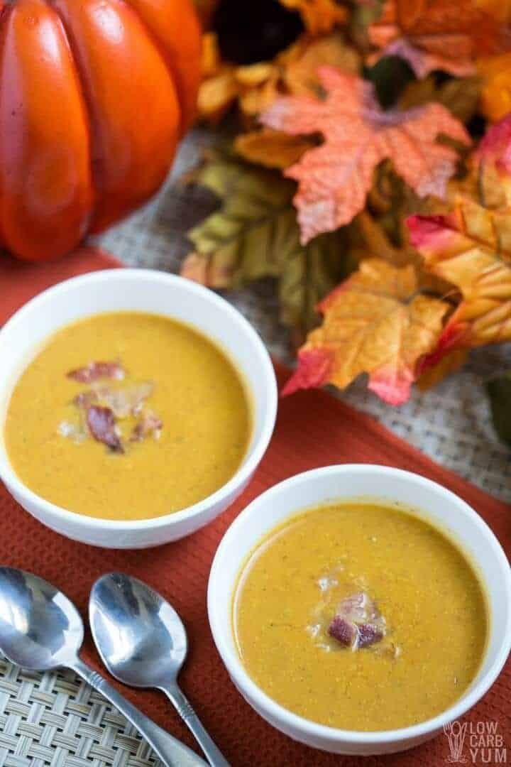 Low-Carb Pumpkin Soup with Bacon This lower-carb, dairy-free soup satisfies your hunger 'til the main courses come out without bogging you down too much. Top it with your favorite herbs for extra oomph. GET THE RECIPE Per serving: 95 calories, 4 g fat (1 g sat), 7 g carbs, 3 g sugar, 282 mg sodium, 2 g fiber, 5 g protein Courtesy
