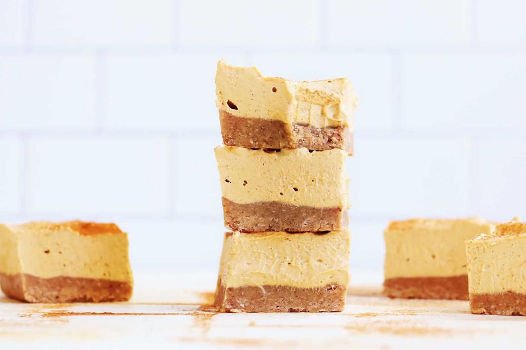 Vegan Pumpkin Pie Cheesecake Bars These vegan pumpkin pie cheesecake bars taste just like the real deal. Made with pumpkin, cashews, pecans, cinnamon, and coconut, they pack healthy fats you'll feel good about enjoying. GET THE RECIPE Per serving: 435 calories, 34.2 g fat (17.1 g sat), 28.2 g carbs, 13 g sugar, 12 mg sodium, 4.9 g fiber, 7.3 g protein Courtesy