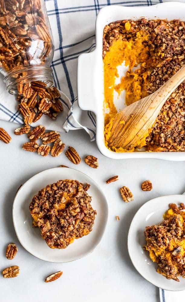 Cinnamon Pecan Sweet Potato Casserole This sweet and nutty casserole uses coconut oil and coconut sugar to create a still-sweet but lower-sugar version of the classic Thanksgiving side. Oh yeah, it also comes together in just 30 minutes. GET THE RECIPE Per serving: 282 calories, 8.4 g fat (5.5 g sat), 49.4 g carbs, 12.8 g sugar, 49 mg sodium, 5.8 g fiber, 3.1 g protein Courtesy
