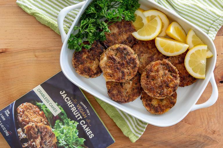 Jackfruit Cakes Jackfruit is all the rage now for its versatile texture and neutral taste. These seafood-free crab cakes make the perfect hearty snack or main dish. Per serving : 150 calories, 6 g fat (1.5 g saturated fat), 21 g carbs, 1 g sugar, 470 mg sodium, 6 g fiber, 2 g protein Trader Joe's