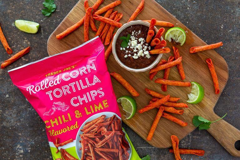Chili & Lime Flavored Rolled Corn Tortilla Chips Fact: Folded chips taste better than regular chips. I dare you to argue differently. Per serving : 150 calories, 8 g fat (0.5 g saturated fat), 17 g carbs, 0 g sugar, 260 mg sodium, 2 g fiber, 2 g protein Trader Joe's
