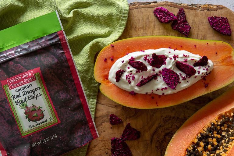 Crunchy Red Dragon Fruit Chips Beet chips just got a pretty sweet upgrade. This fruity take on burgundy-hued chips is made with nothing but dragon fruit itself. Yum! Per serving : 120 calories, 1.5 g fat (0 g saturated fat), 24 g carbs, 15 g sugar, 0 mg sodium, 2 g fiber, 2 g protein Trader Joe's