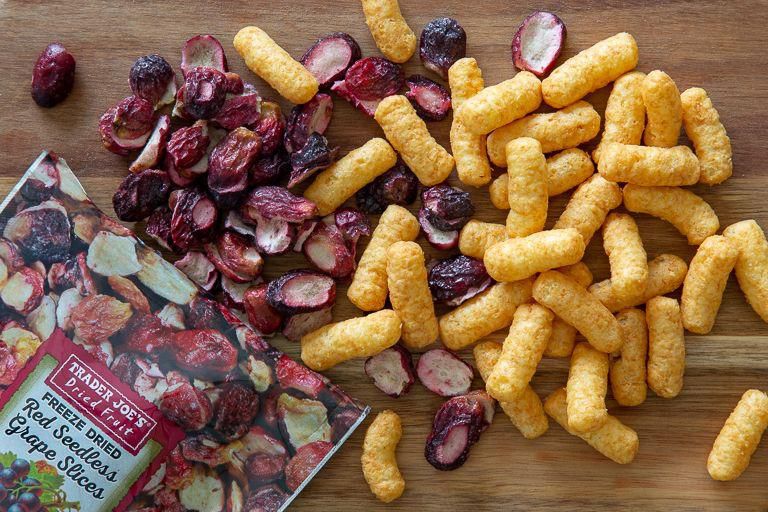 Freeze-Dried Red Seedless Grape Slices If youre not a huge raisin fan and keep finding that your fresh grapes go bad before you get a chance to eat them, these shelf-stable snacks are a perfectly delish compromise. Per serving : 120 calories, 0 g fat (0 g saturated fat), 31 g carbs, 26 g sugar, 0 mg sodium, 2 g fiber, 1 g protein Trader Joe's