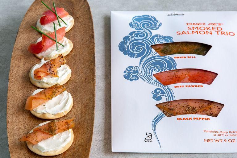 Smoked Salmon Trio Running to your fave deli for a massive bagel and lox is great for lazy Sunday mornings, but sometimes you just need a bite to hold you over. This omega-3 packed snack should do the trick. Per serving : 80 calories, 3.5 g fat (0.5 g saturated fat), 0 g carbs, 0 g sugar, 610 mg sodium, 0 g fiber, 11 g protein Trader Joe's
